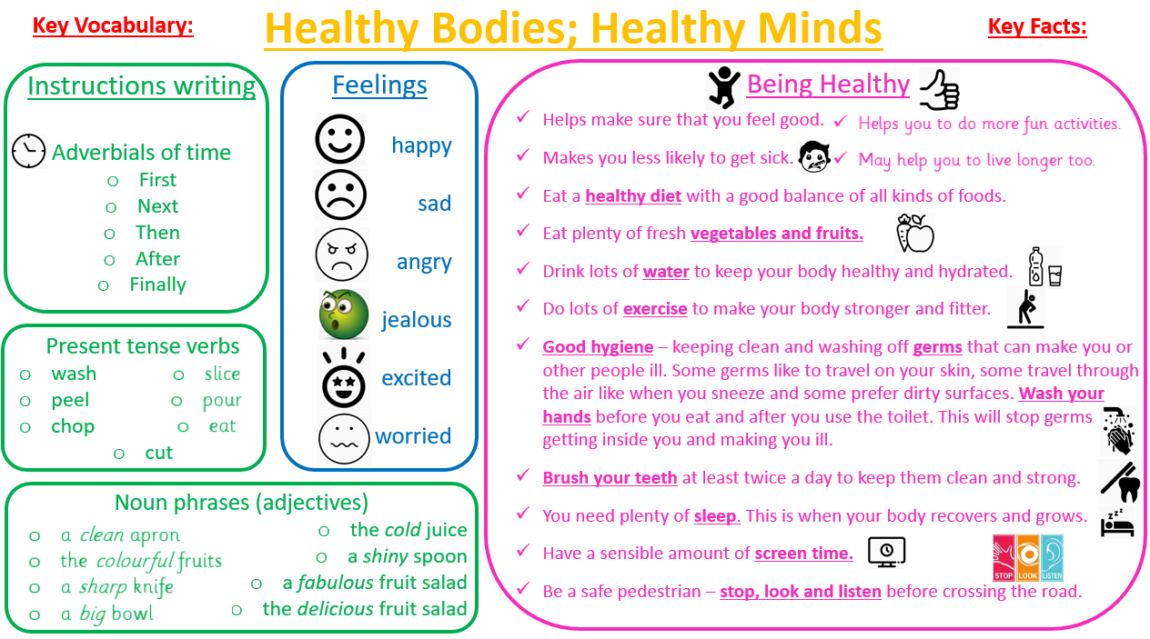- learning all about the importance of physical exercise and a healthy diet for good health in Science as well as ways to keep healthy and safe (such as tooth brushing, hand washing, screen time, sleep routine and being a safe pedestrian.)